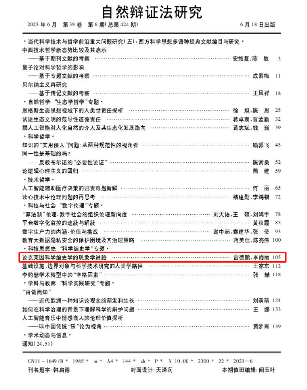 公司教师雷德鹏、博士研究生李霞丽在《自然辩证法研究》(2023年第6期)上发表理论文章《论克莱因科学史编史学的现象学进路》。
