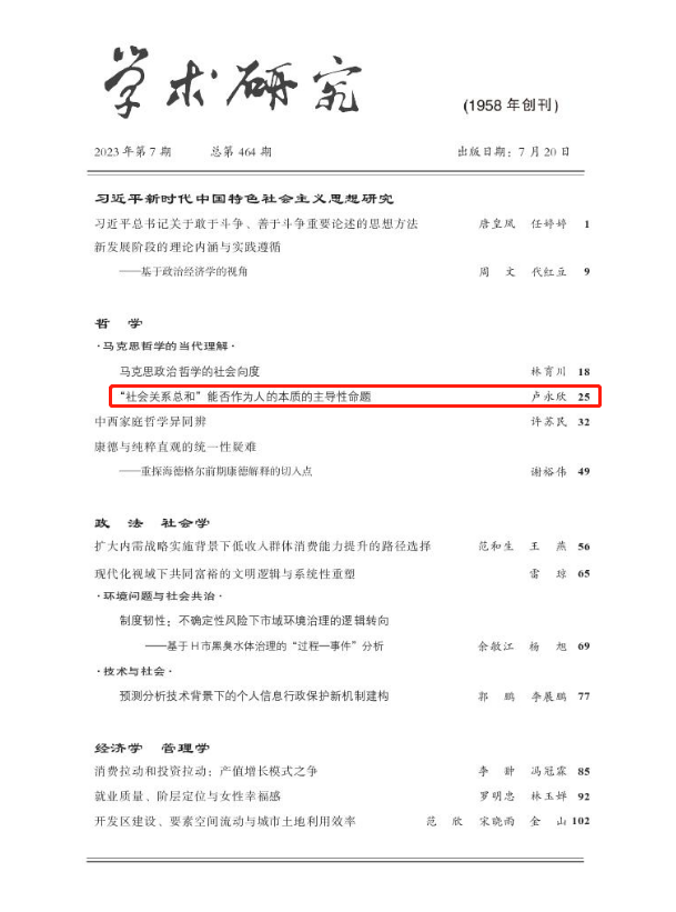 公司教师卢永欣在《学术研究》(2023年第7期)上发表理论文章《“社会关系总和”能否作为人的本质的主导性命题》。