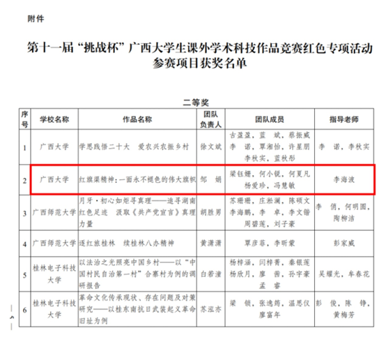 近日,由共青团广西区委、自治区教育厅、自治区科协、广西学联共同主办的第十一届“挑战杯”广西老员工课外学术科技作品竞赛红色专项活动获奖名单公布,公司推报的作品《红旗渠精神:一面永不褪色的伟大旗帜》荣获二等奖!