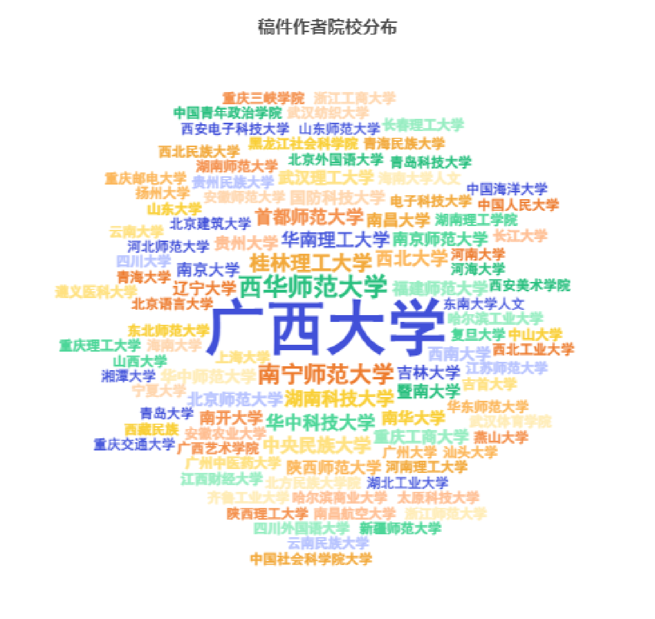 从院校分布来看,本分论坛共收到来自全国100余所高校和科研院所的青年学子的投稿。其中,投稿数量位于前十的高校分别为威廉希尔、西华师范大学、南宁师范大学、桂林理工大学、湖南科技大学、华南理工大学、华中科技大学、首都师范大学、西北大学、中央民族大学。此外,还收到了复旦大学、国防科技大学、中山大学、吉林大学、四川大学、暨南大学等众多高校员工的来稿。
