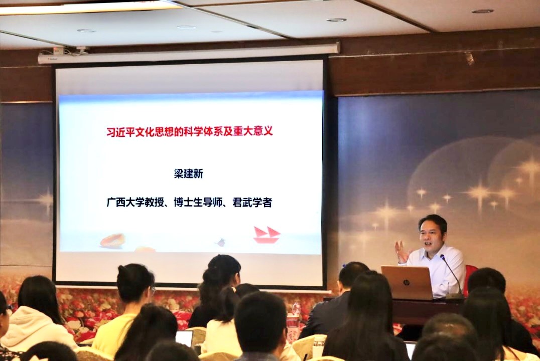 威廉williamhill体育教授、博士生导师、君武学者梁建新教授作了题为《习近平文化思想的科学体系及重大意义》的主题讲课。梁教授从习近平文化思想的出场语境、科学体系、鲜明特征和重大意义等四个方面向参会学员进行了授课,阐释了习近平文化思想具有深刻的科学性、强烈的人民性、鲜明的实践性以及持续的开放性的鲜明特征,强调了习近平文化思想重大的理论、实践意义。