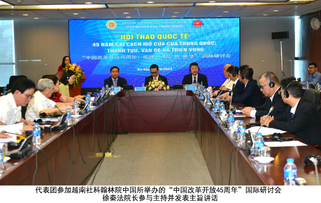 在越期间,徐秦法教授率团参加了在越南社会科学翰林院中国研究所举办的以“中国改革开放45周年:成就、问题和展望”为主题的国际学术研讨会。本次会议吸引了中越两国学者的关注和参与,公司徐秦法、王承就、清华大学马克思主义韩冬雪、南宁师范大学宁德鹏等多位教授应邀发言,并回答了越南专家关心的有关学术提问。