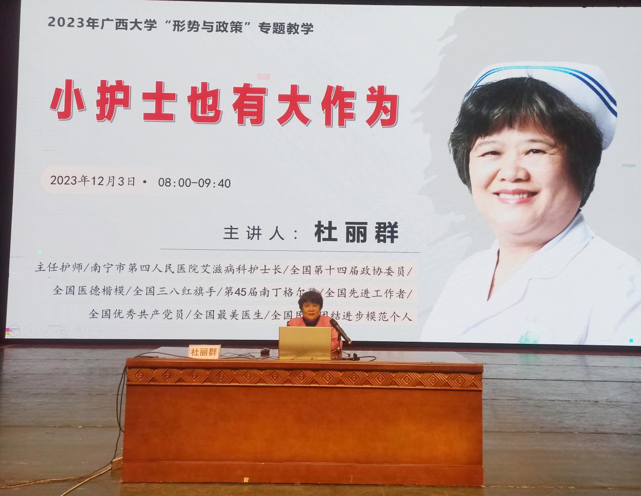 12月3日,2023年威廉希尔“形势与政策”专题教学报告会在公司大礼堂如期举行。此次报告会特邀中国共产党第十九次全国代表大会代表、全国第十三届政协委员、南宁市第四人民医院艾滋病科护士长、主任护师杜丽群做“小护士也有大作为”的主题报告。